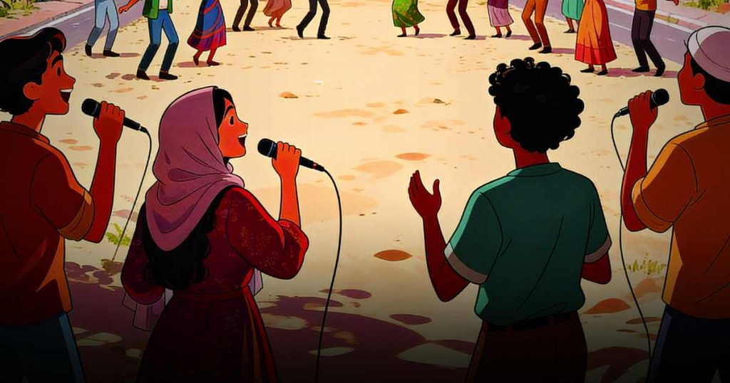 One such tradition appears like a memory woven into the visuals: in times of drought, children with coal-darkened faces wander from home to home, bowls cupped in their hands, offering prayers for rain. Neighbours respond with grains (wheat, chickpeas, pulses, etc.). Which the community later cooks and shares before gathering for a collective prayer.